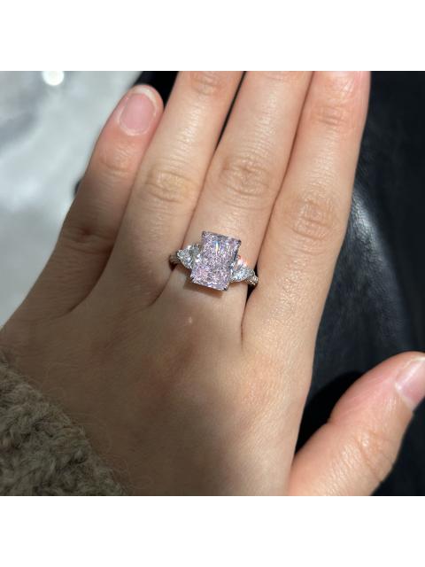 • Radiant geslepen fancy roze sterling zilveren 3-stenen verlovingsring